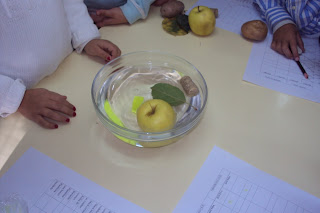 • Experiência sobre flutuação: O que afunda e o que flutua na água, com tabela comparativa construída pelos alunos.