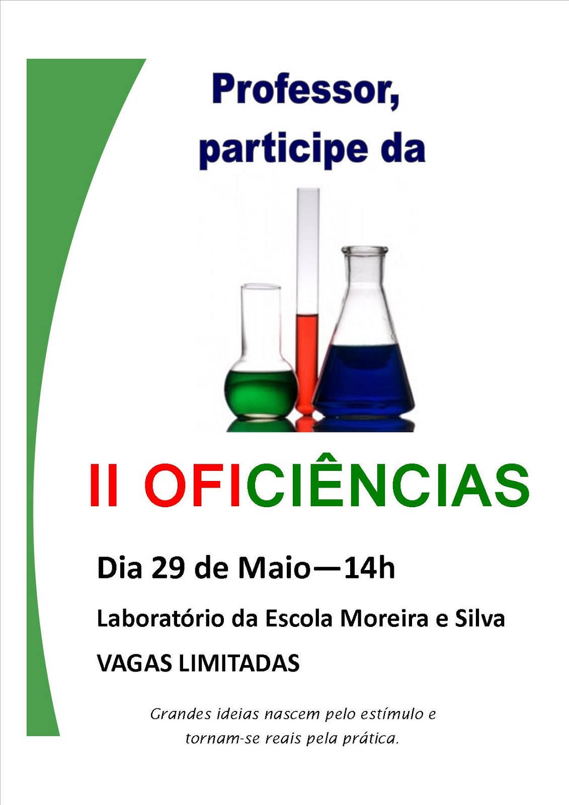 Acontecerá amanhã a II OFICIÊNCIAS: Oficina de formação para professores. Este ano com tema Experimentos de Química com o Prof. Aristóphio A.Alves Filho(LCN-CECITE) e a Profª. Glaucia Esteves(15ª CRE). O encontro acontecerá no Laboratório da Escola Moreira e Silva, das 14h às 17h30.